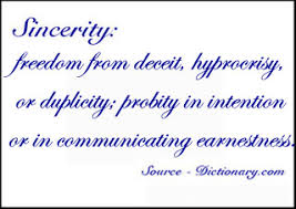 Sincerity... freedom from deceit, hyprocrisy or duplicity, probity in intention or in communicating earnestness....